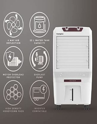 - Product: Crompton Marvel Neo 23 Personal Air Coolerwith water tank capacity (upto brim) of 23 L; Suitable for 150 sq. ft. room size