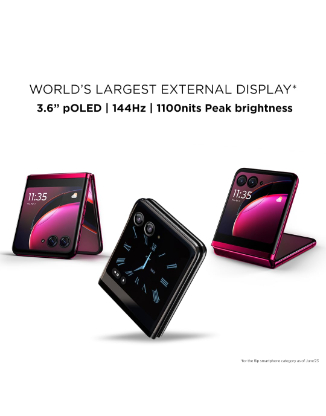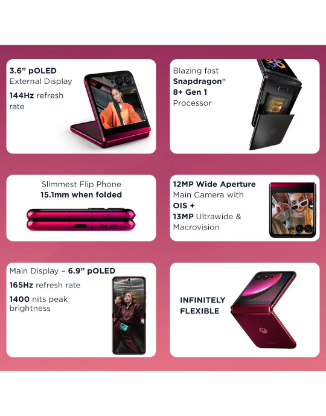 | Special features | ?Sensors – Fingerprint reader, Proximity + light sensor, Ambient light sensor, Accelerometer, Gyroscope, eCompass, Hall sensor, Main Camera – 12MP (f/1.5, 1.4?m) | OIS, Rear Camera – 13MP (f/2.2, 1.12?m) | Ultra-wide + macro | FOV 108?, Single LED flash, Front Camera – Main display 32MP (f/2.4, 0.7 ?m) | 8MP (f/2.4, 1.4um) Quad Pixel External display Main: 12MP (f/1.5, 1.4?m) | OIS Wide: 13MP (f/2.2, 1.12?m) | FOV 108?, Main display: 6.9″” FHD+ pOLED display External display,3.6″” pOLED display, Corning? Gorilla? Glass Victus on both front and rear, IP52 Water-repellent design, Battery -3800mAh non-removable, 30W TurboPower? charging support 5W wireless charging support (charger sold separately), Dual stereo speakers with Dolby Atmos? and Spatial Sound Qualcomm? Snapdragon Sound?, Snapdragon 8+ Gen 1 Mobile Platform, 8GB LPDDR5 RAM, 256GB built-in UFS 3.1 Storage, Display Resolution – Main display: FHD+ (2640 x 1080) | 413ppi , External display: 1066 x 1056 | 413ppi |